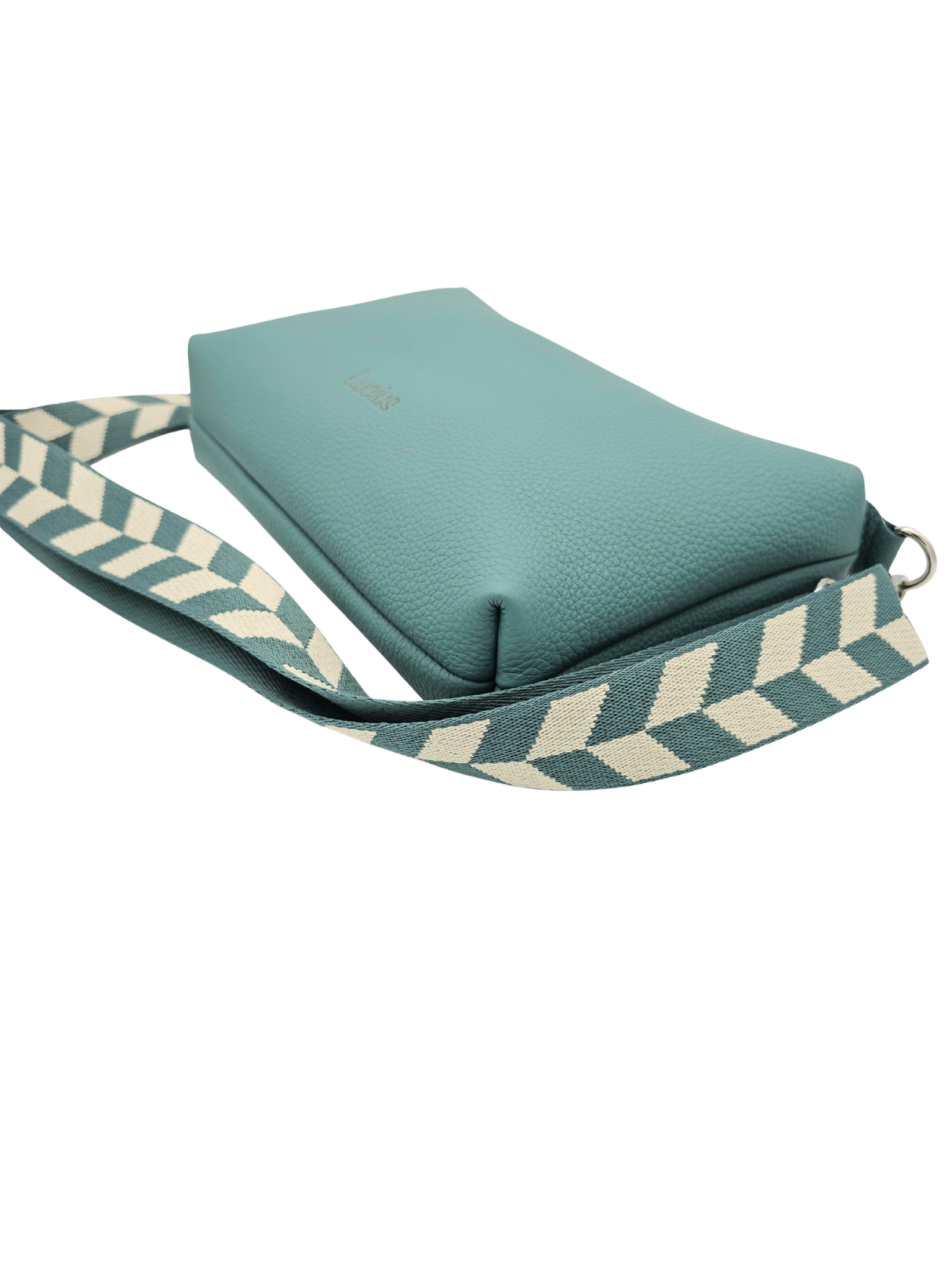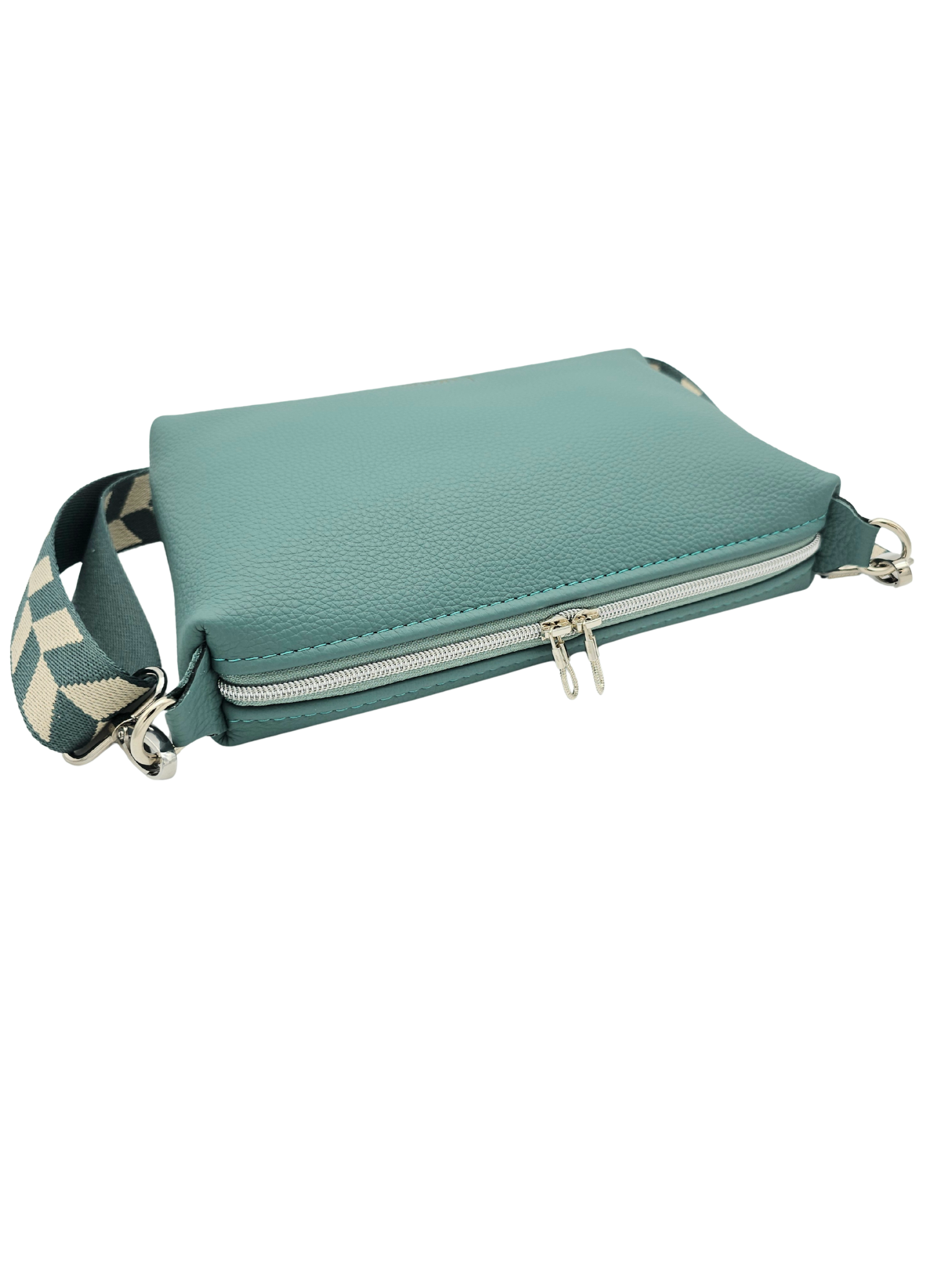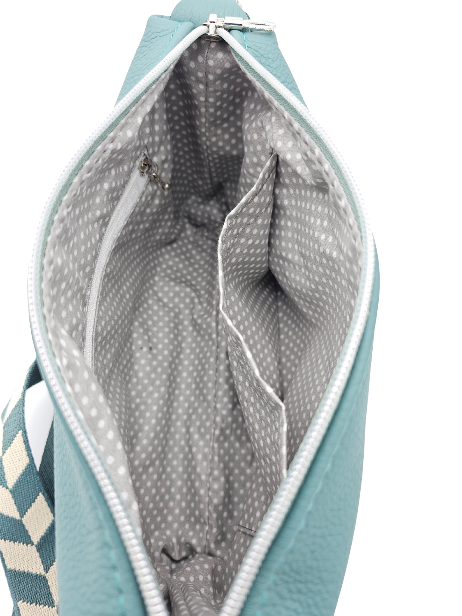 Die klare rechteckige Form ist praktisch und modern. Ein sicherer Reißverschluss oben, eine zusätzliche  Reißverschlusstasche auf der Rückseite, sowie ein hochwertiges Innenfutter aus Baumwolle sorgen für Funktionalität und Langlebigkeit. Innen findest du ein Reißverschlussfach und ein Steckfach. Ideal für Ordnung unterwegs. Der abnehmbare, verstellbare Textilgurt ermöglicht verschiedene Tragevarianten.