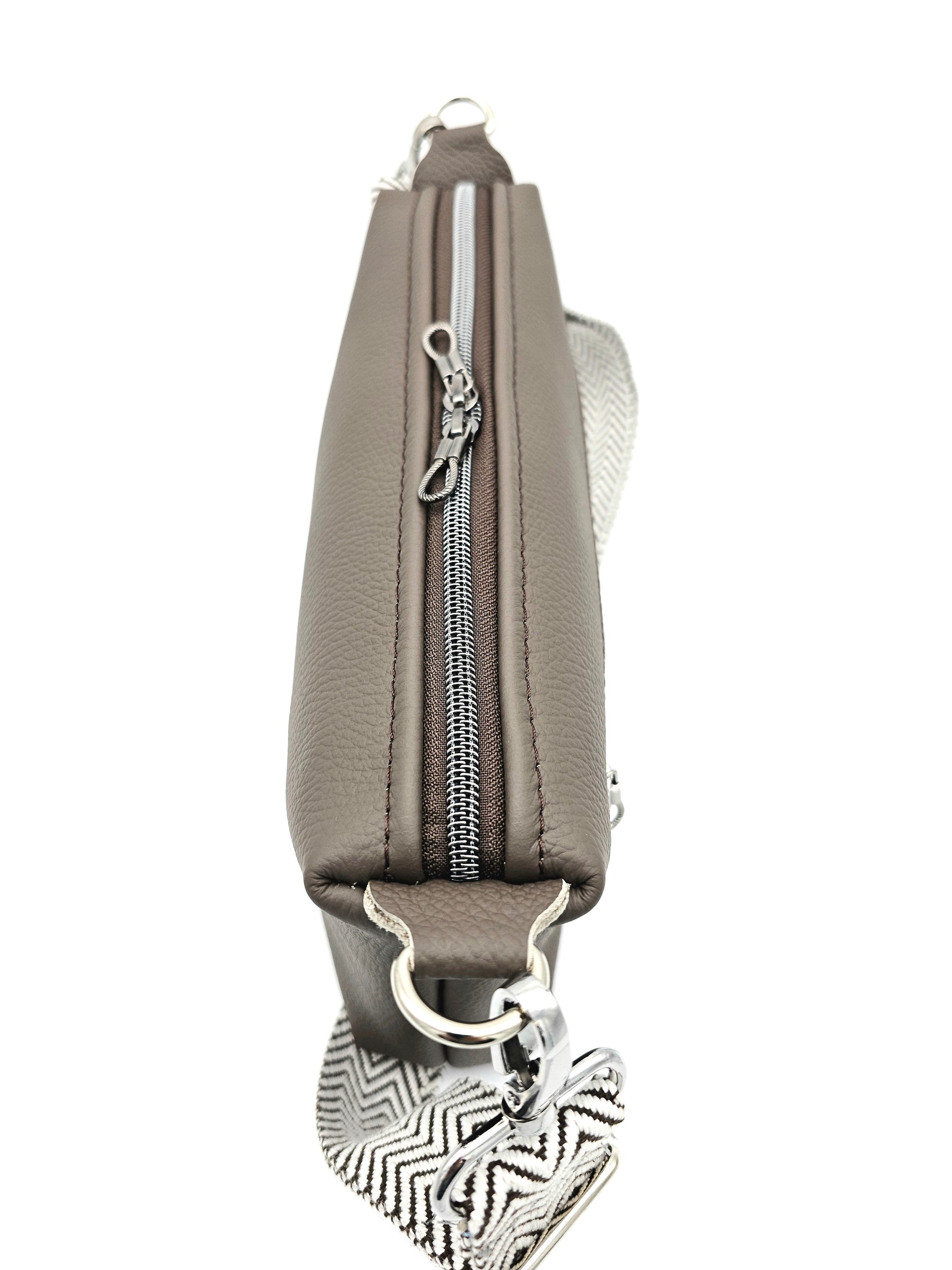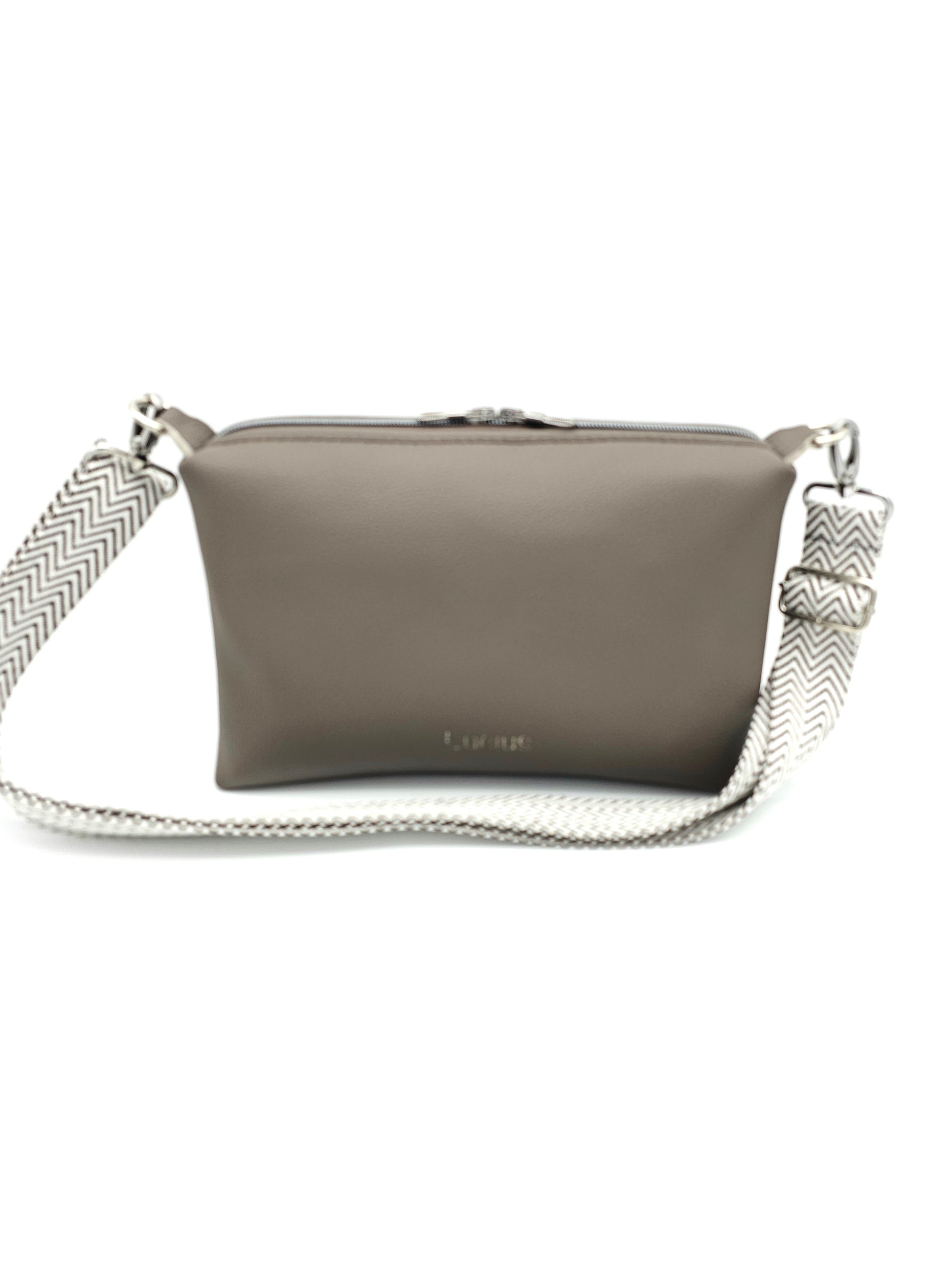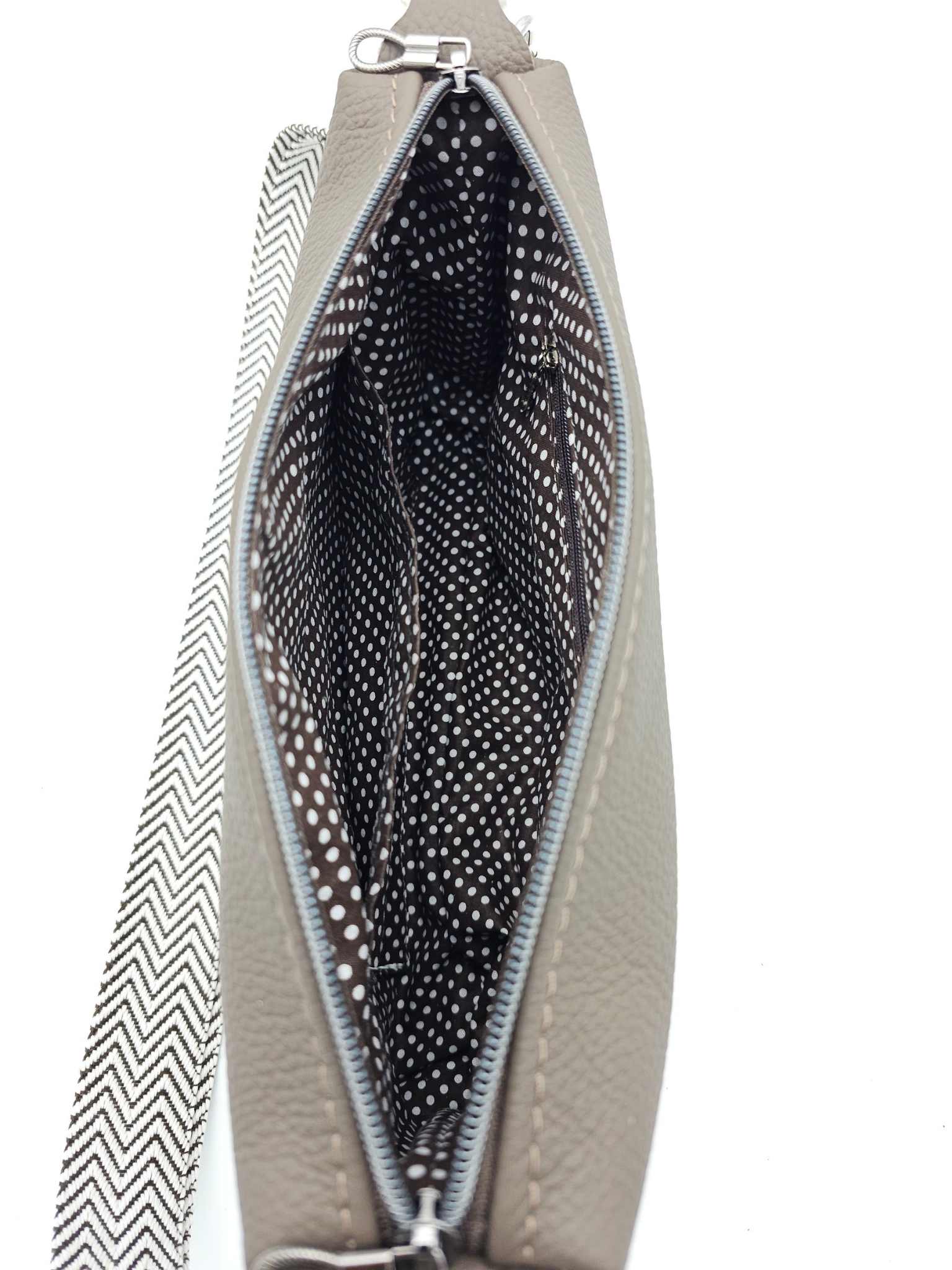 Die klare rechteckige Form ist praktisch und modern. Ein sicherer Reißverschluss oben, eine zusätzliche  Reißverschlusstasche auf der Rückseite, sowie ein hochwertiges Innenfutter aus Baumwolle sorgen für Funktionalität und Langlebigkeit. Innen findest du ein Reißverschlussfach und ein Steckfach. Ideal für Ordnung unterwegs. Der abnehmbare, verstellbare Textilgurt ermöglicht verschiedene Tragevarianten.