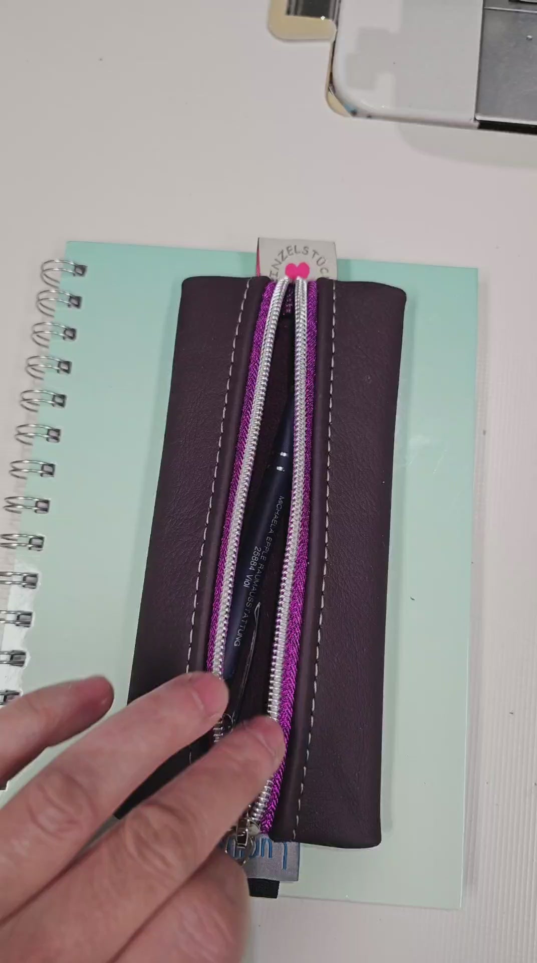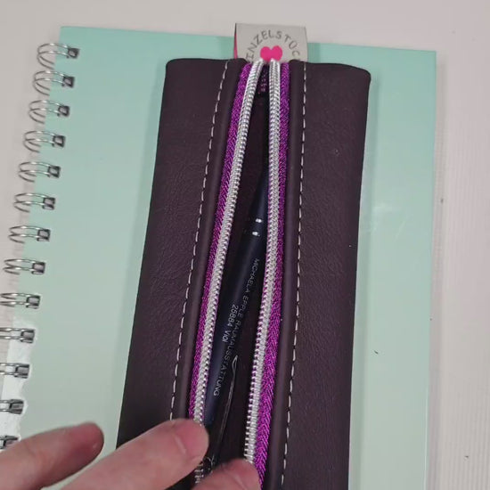 Dieses handgefertigte Stiftemäppchen in Lila mit Glitzer vereint edles Design mit einer praktischen Funktion. Das breite, eingenähte Gummiband ermöglicht es dir, das Mäppchen mühelos an deinem DIN-A5-Notizbuch, Kalender oder Buch zu befestigen. So hast du deinen Lieblingsstift immer sicher verstaut und sofort griffbereit – ob im Alltag, im Büro oder unterwegs.