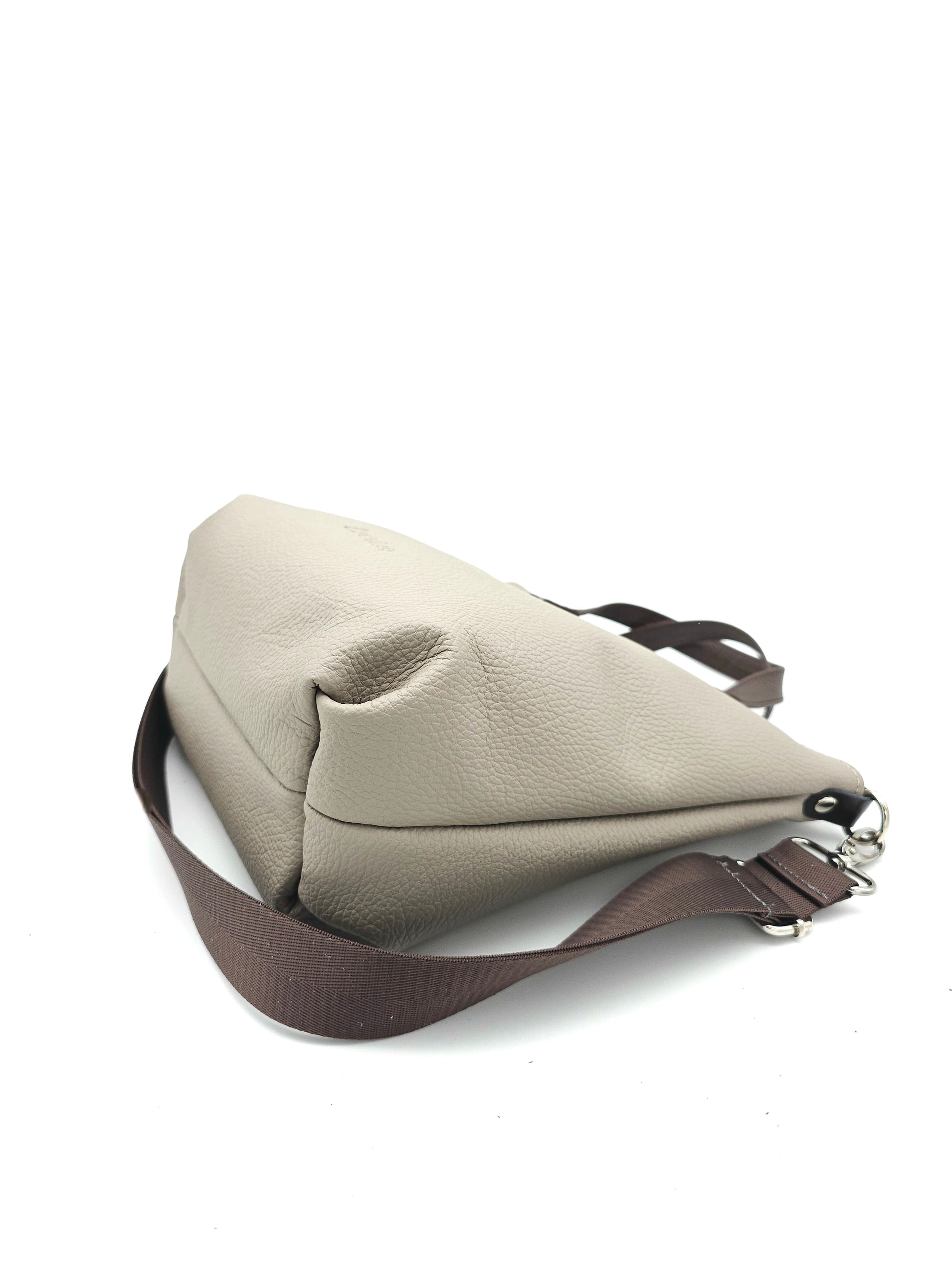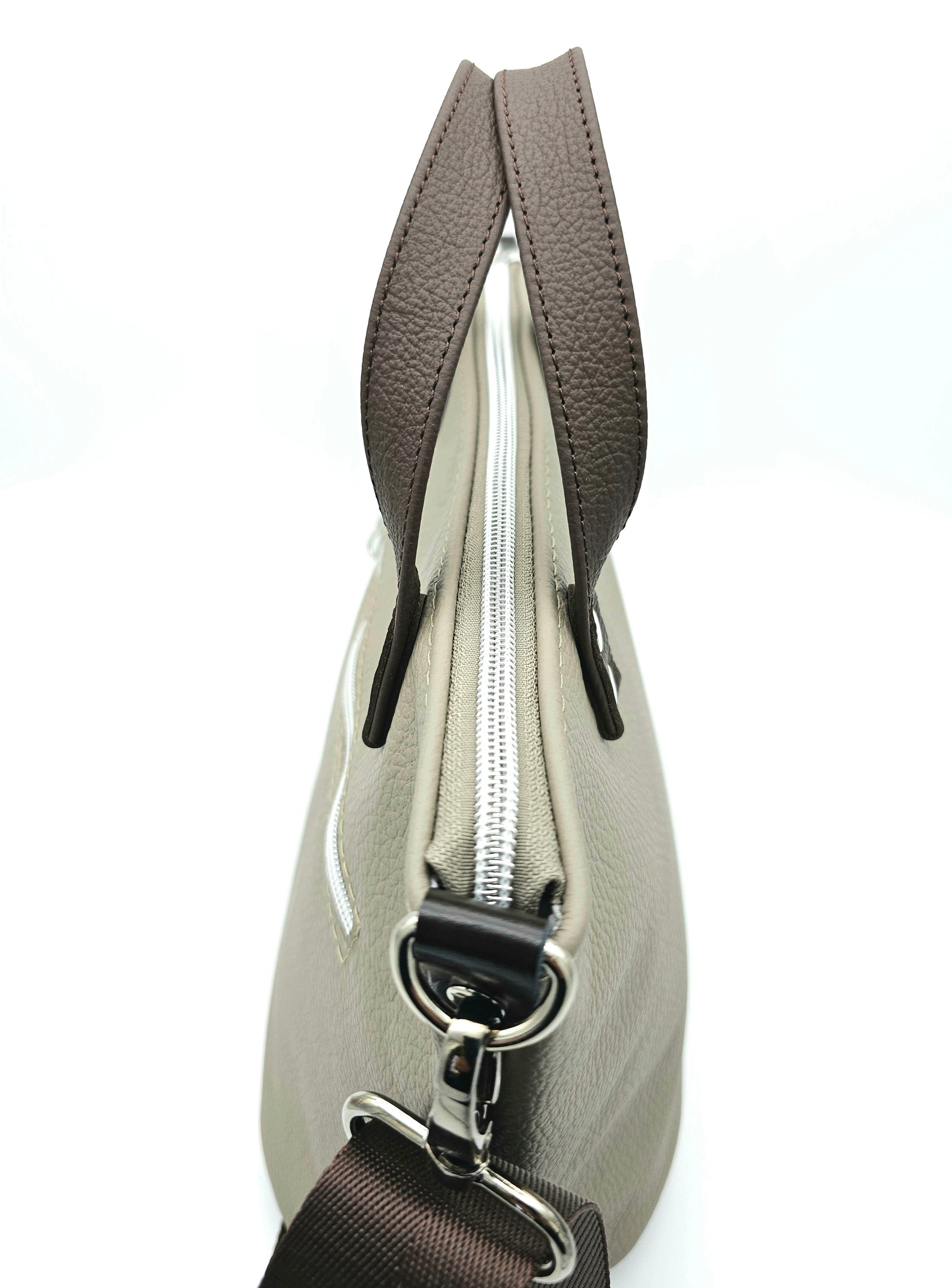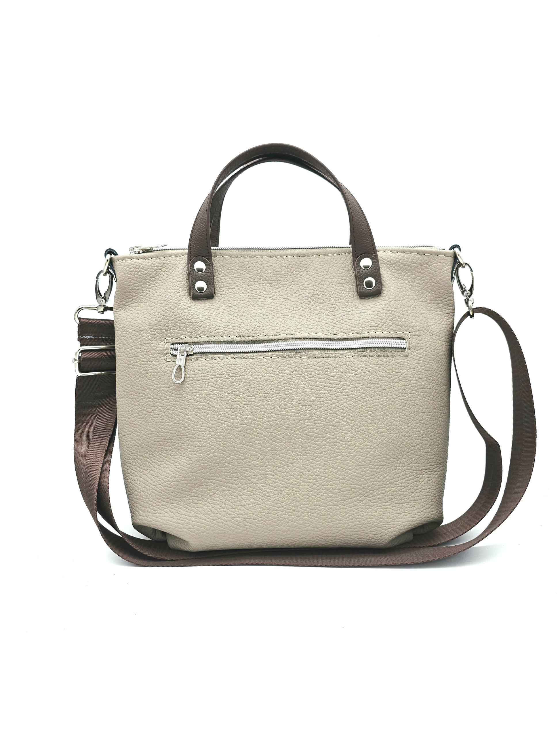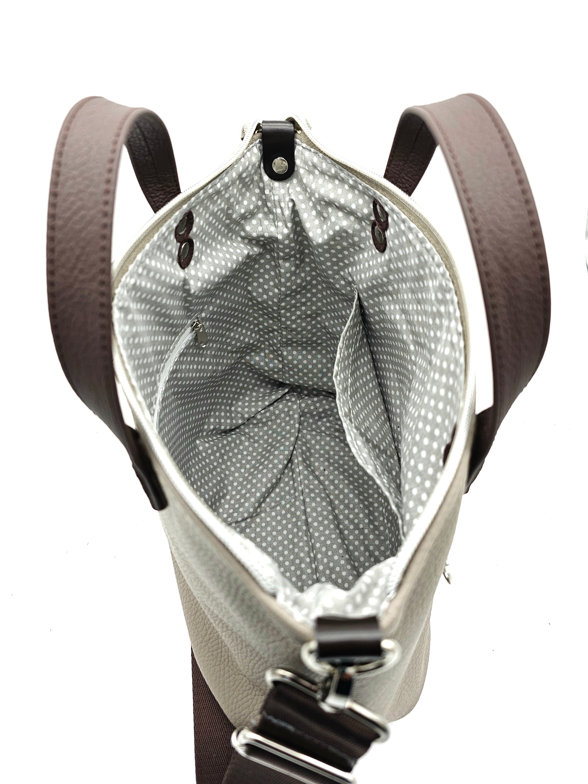 Die Tasche Katja in Cappuccino mit Griffen und Schultergurt in Schokobraun ist ein Einzelstück mit Stil!